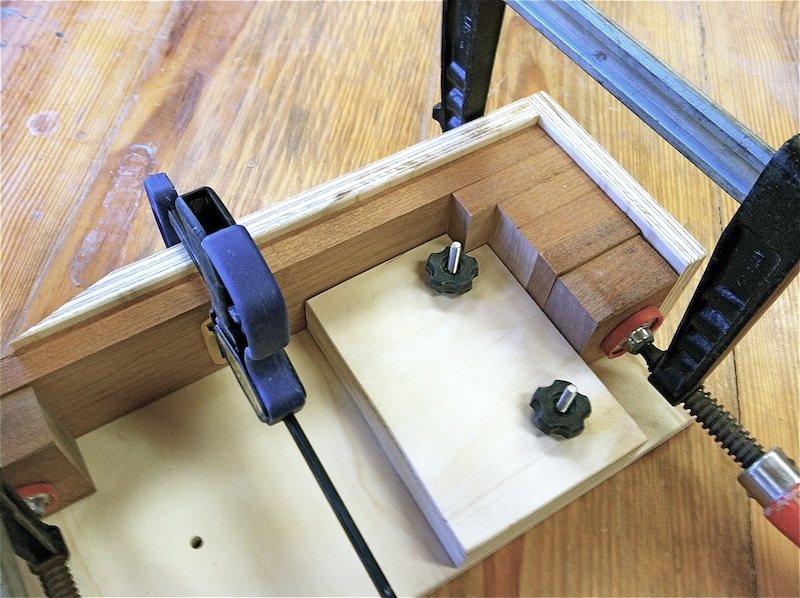 If all looks well, glue all blocks in place using the clamping cauls to prevent denting of the stock. Note that is is a good idea to place waxed paper beneath the neck prior to gluing to minimize cleanup and damage to the jig.